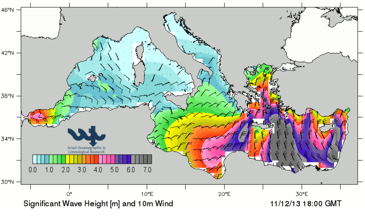 במפת התחזית אפשר לראות שמחר בערב הגלים יגיעו לגובה של 7 מטר ויותר (צבע אפור) ורוחות של 40 קשרים (75 קמ"ש).